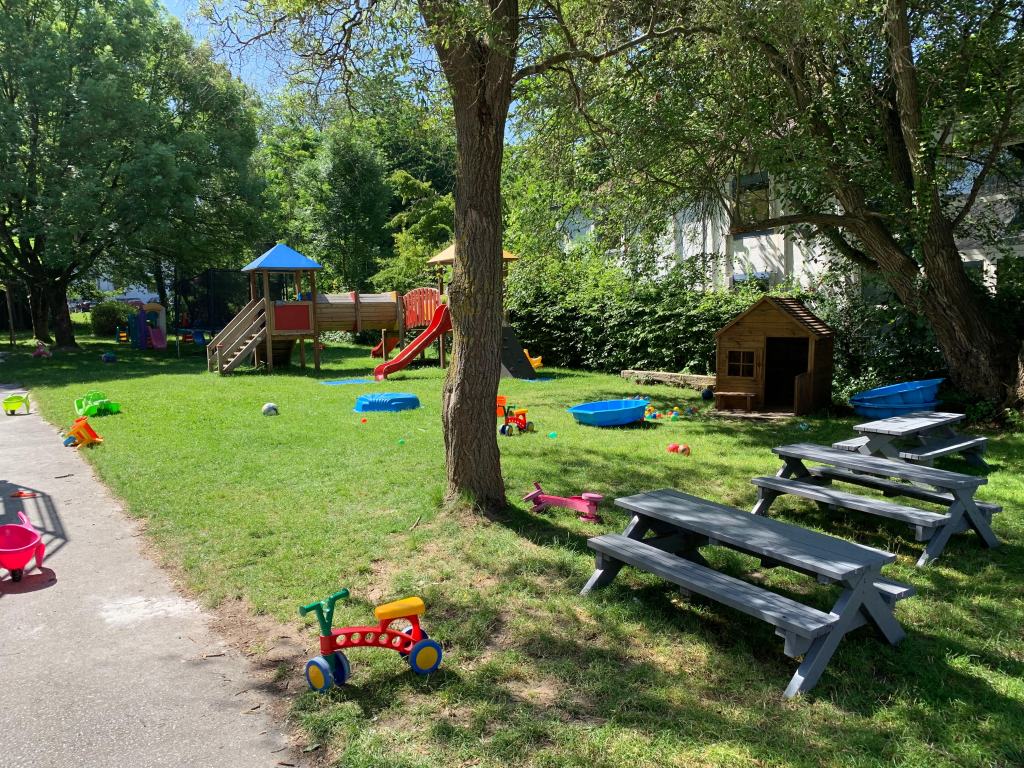 Le jardin est équipé de tables et bancs en bois pour les enfants. Les bébés peuvent aussi profiter du jardin lorsque le temps le permet.